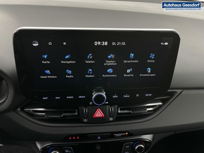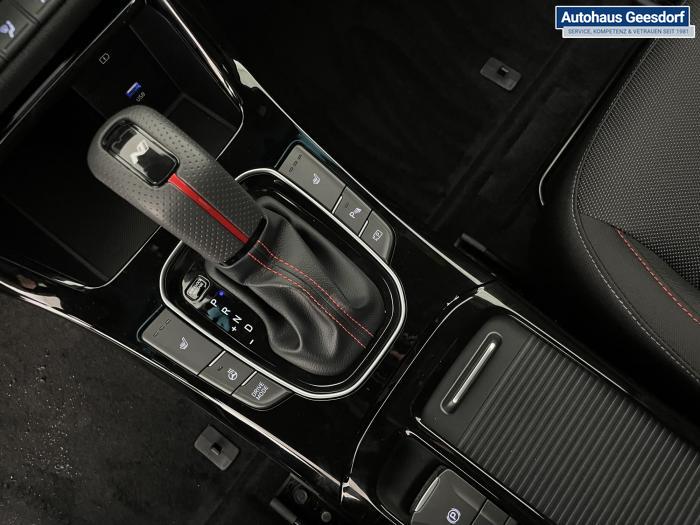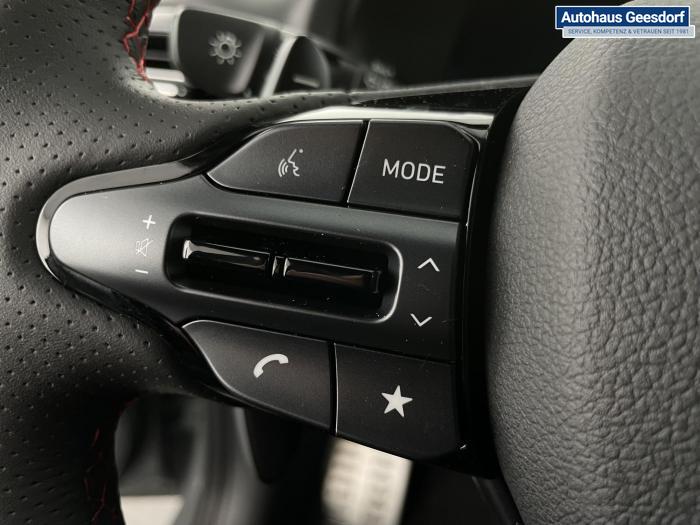 Android Auto, Apple CarPlay, Bluetooth, Navigationssystem 10,25'', Sprachsteuerung, USB-Anschluss, Bi-LED-Scheinwerfer, LED Tagfahrlicht, LED-Rückleuchten, Lichtsensor, Elektrische Fensterhebern vorn und hinten, Getönte Scheiben, Dachhimmel in Schwarz, Gepäcktrennnetz, Lenkradheizung, Mittelarmlehne vorn und hinten, Spiegel automatisch abblendbar, Sport - Multifunktionslenkrad, Sport-Pedale in Edelstahl, Automatische Zweizonen - Klimaregelung , 18'' Alufelgen der Größe 225/40 R18, Alarmanlage, Elektrische Parkbremse mit AutoHold, Fahrer- und Beifahrerairbag, ISOFIX + TopTether, Vorder- und Seitenaribags, Beifahrersitz höhenverstellbar, Fahrersitz höhenverstellbar, Fahrersitz mit elektrischer Lendenwirbelstütze, Vordersitze beheizbar, Hyundai Garantie 5 Jahre, Aktiver Spurfolgeassistent LFA, Autonomer Notbremsassistent, Fahrprofilauswahl, Frontkollisionswarner mit Fußgänger-/Fahrradfahrererken-nung FCA, Intelligente Geschwindigkeitsassistent ISLA, Park Distance Control vorne und hinten, Reifendruck-Kontrollsystem, Rückfahrkamera, Spurhalteassistent LKA, Tempomat, Zentralverriegelung mit Fernbedienung, [ISLA] adaptive Geschwindigkeitsregelanlage, Start/Stopp-Automatik, Außenspiegel elektrisch anklappbar, Außenspiegel elektrisch beheizbar, Außenspiegel elektrisch einstellbar, Außenspiegelgehäuse in Schwarz, Dachreling, EU-Fahrzeug mit Tageszulassung